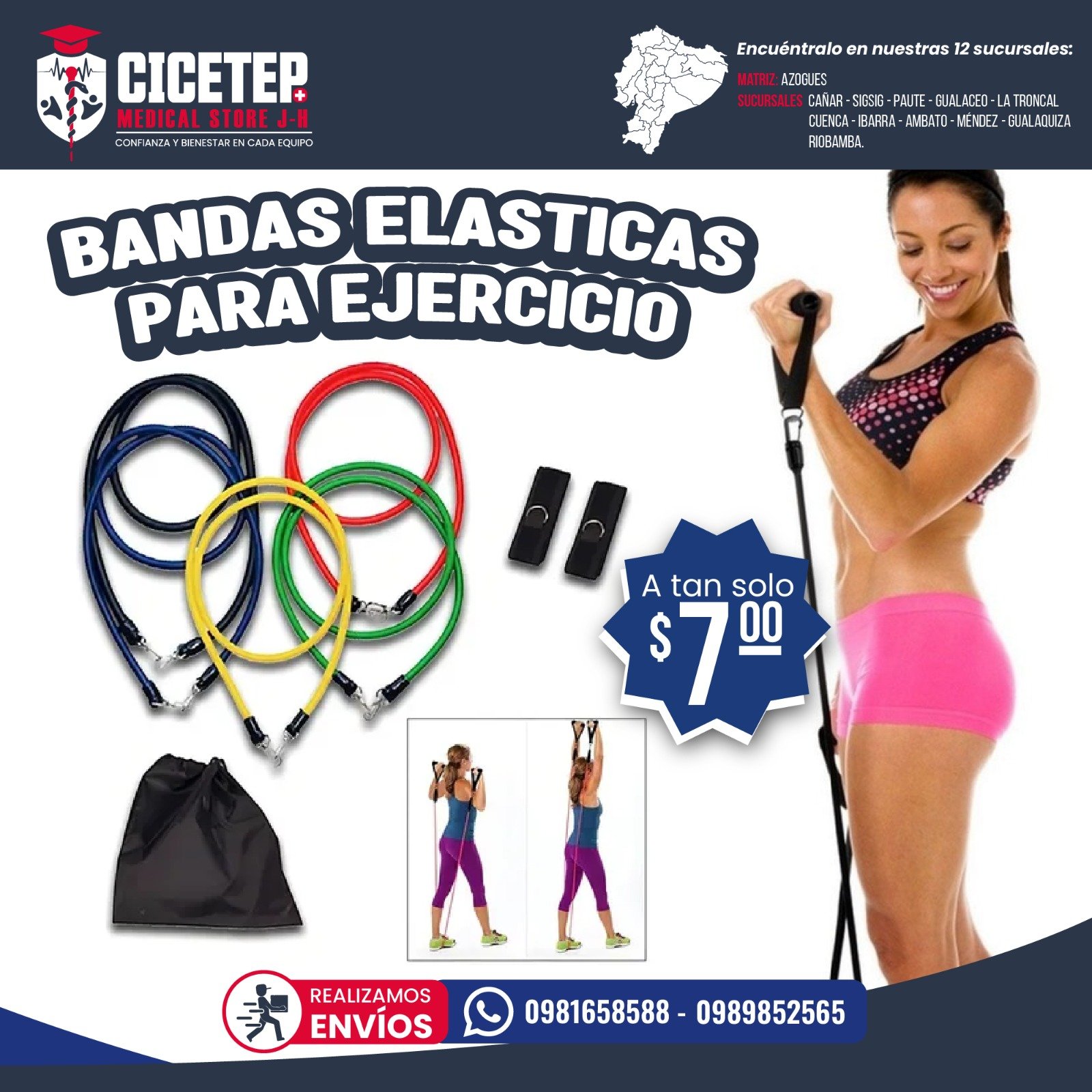 Set de bandas elásticas para ejercicio en 5 niveles de resistencia. Incluye bolsa de almacenamiento. Ideal para tonificación y entrenamiento funcional.