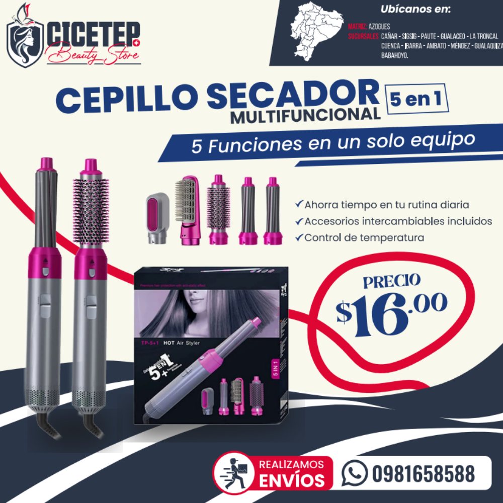 Estilizador multifunción con 5 funciones en un solo equipo. Accesorios intercambiables incluidos. Control de temperatura. Ahorra tiempo en tu rutina diaria.