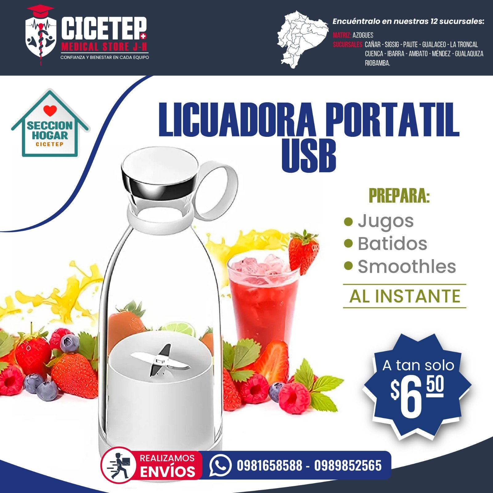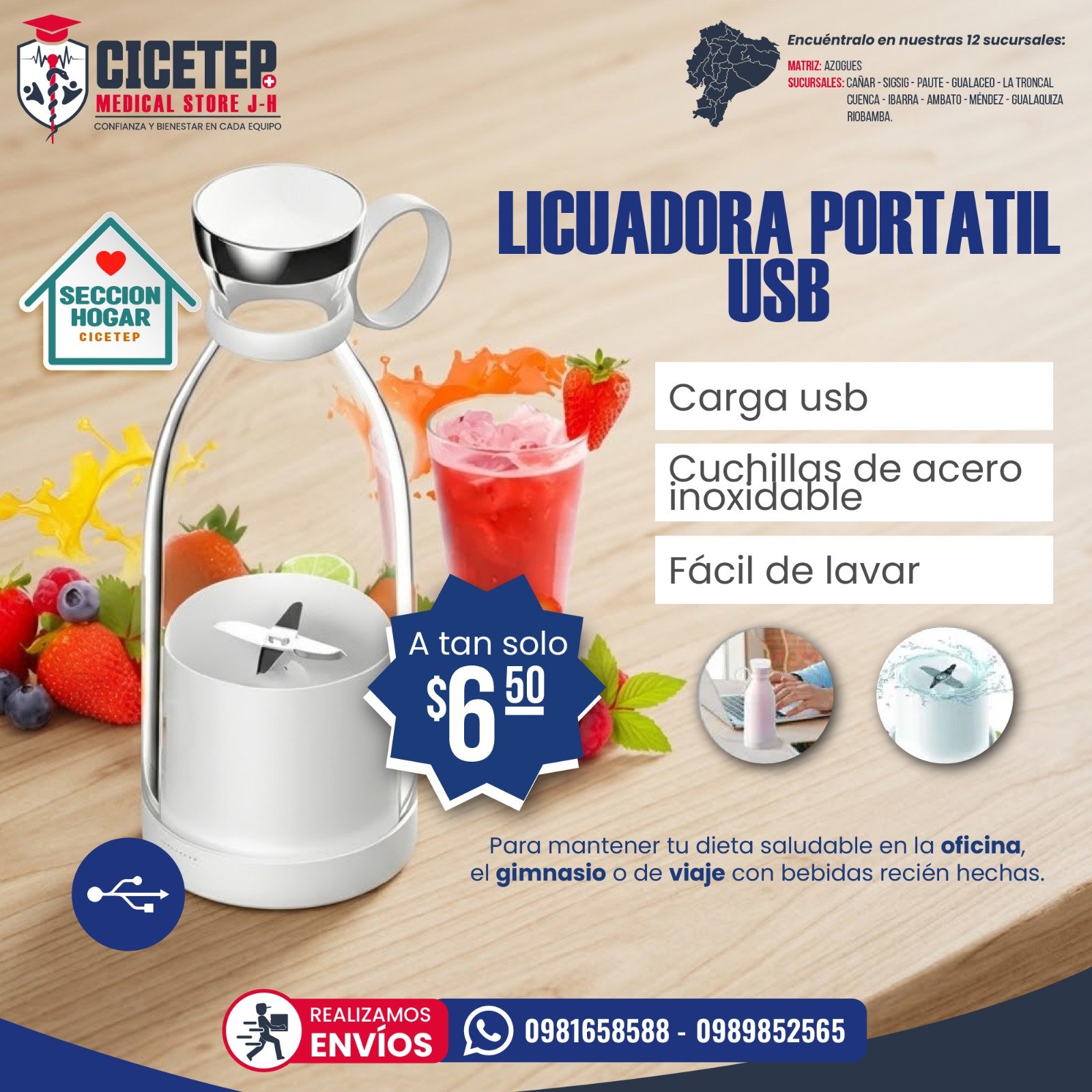 Licuadora portátil de carga USB para preparar jugos, batidos y smoothies al instante. Cuchillas de acero inoxidable de alta durabilidad y fácil limpieza. Perfecta para mantener tu dieta saludable en la oficina, el gimnasio o de viaje.