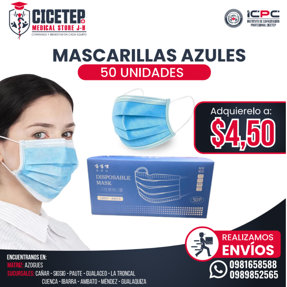 Mascarillas azules desechables de 3 capas. Pack x50 unidades. Uso médico y general.