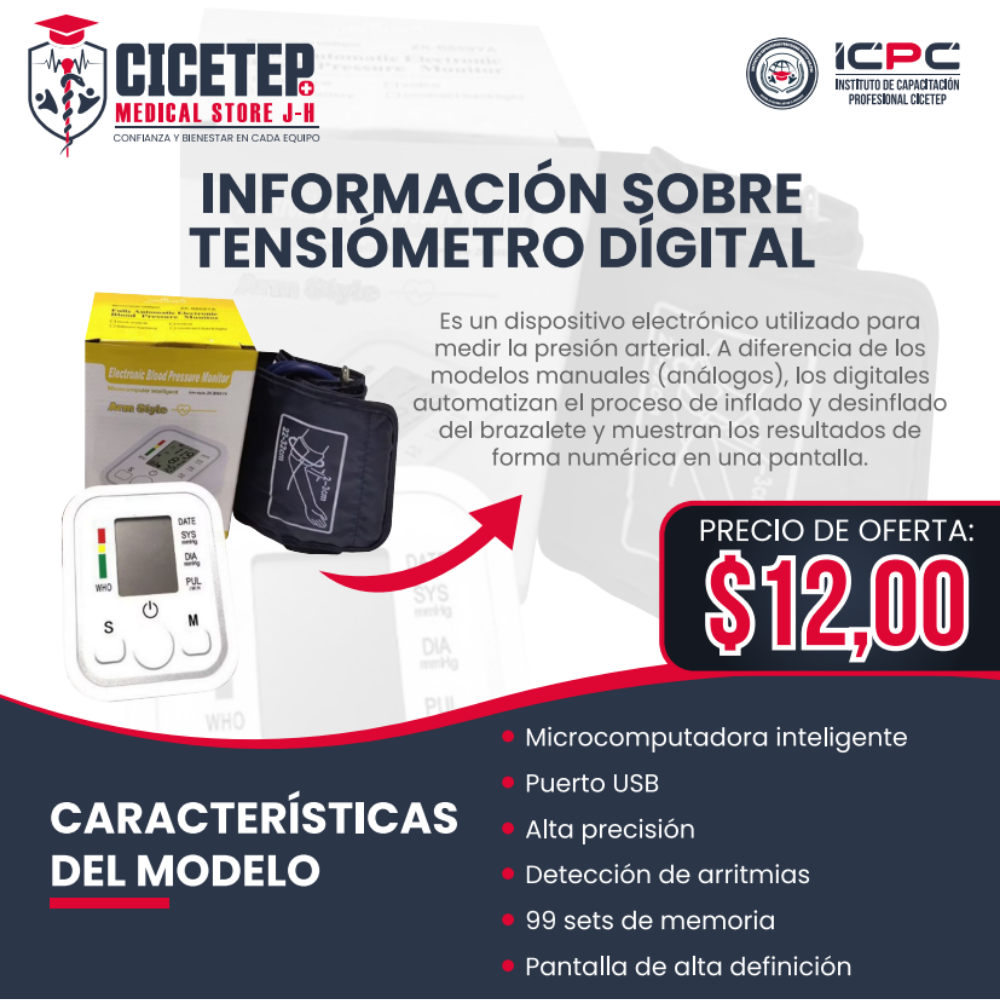 Tensiómetro digital automático de brazo. Microcomputadora inteligente, puerto USB, detección de arritmias, memoria para 99 registros y pantalla de alta definición. Ideal para uso domiciliario y profesional.